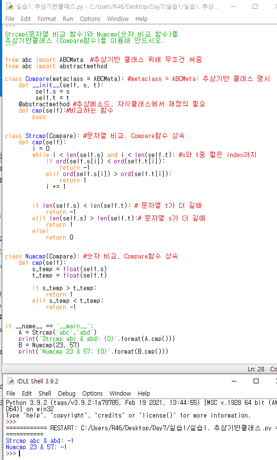 Strcmp(문자열 비교 함수)와 Numcmp(숫자 비교 함수)를 추상기반클래스 (Compare함수)를 이용해 만드시오.