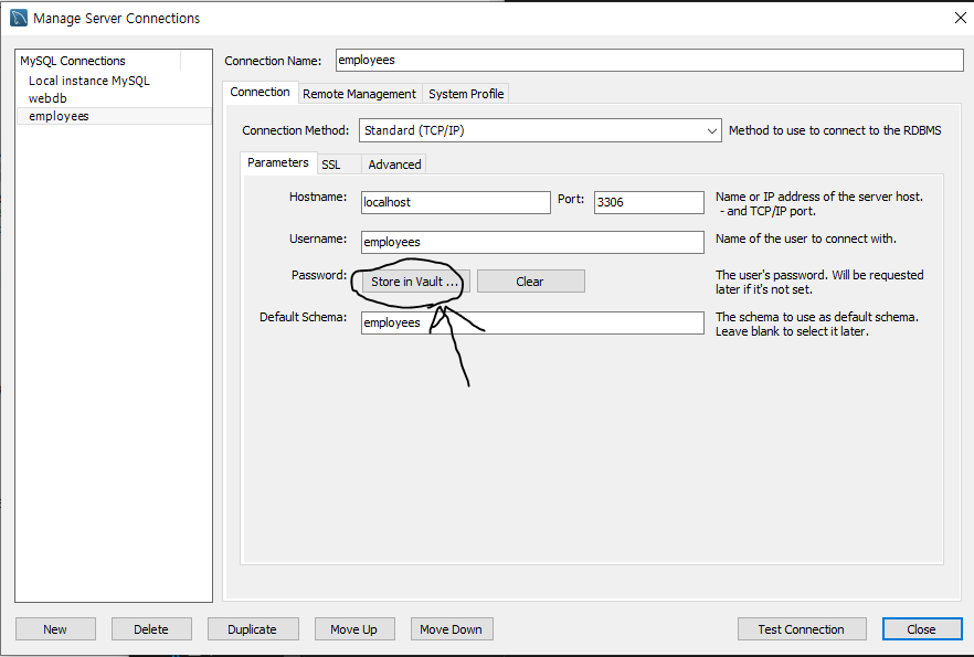 d. workbench에서 employees계정으로 employees DB 접속해보기