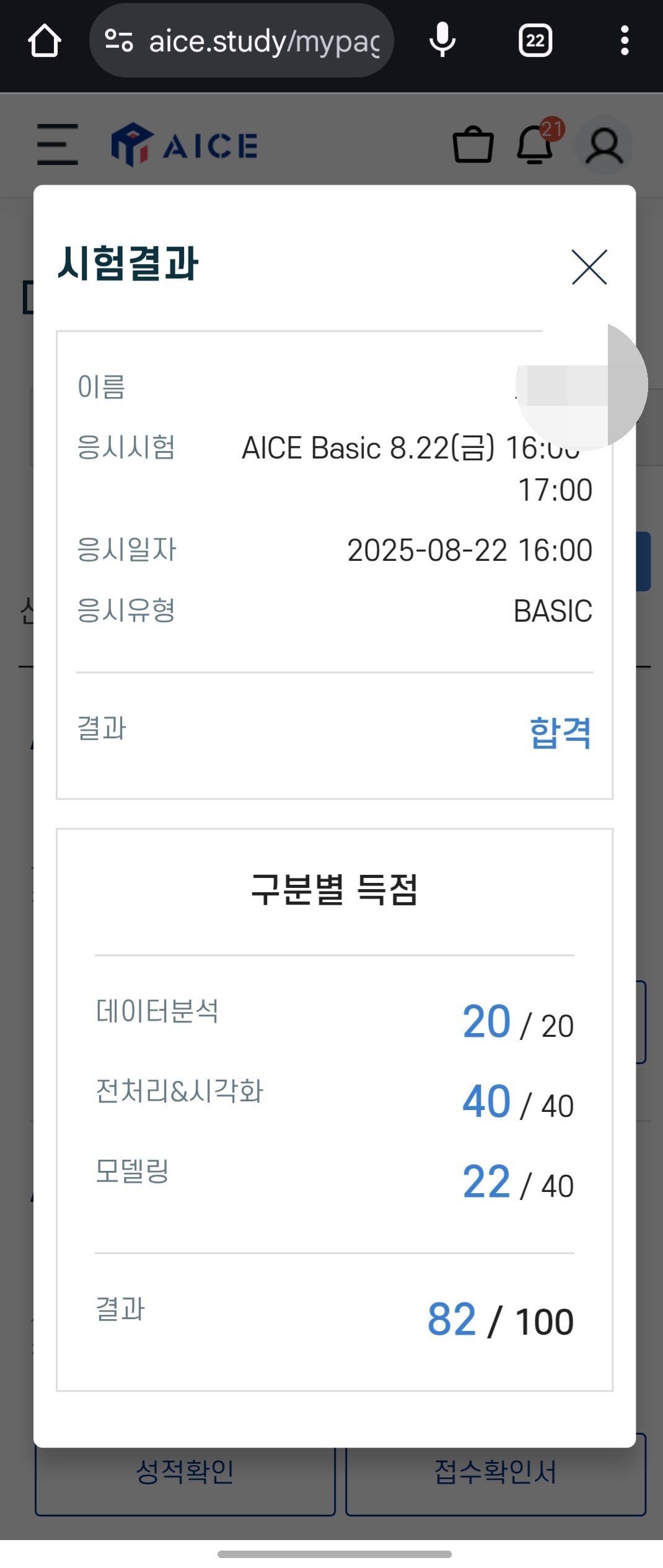 AICE Basic은 파이썬 없이 빅데이터를 분석하는 시험이다. 데이터분석, 전처리와 시각화, 모델링으로 나눠서 채점이 되고, 아무것도 참고할 수 있어 오픈북이 아니다. 집에서 시험을 보지만, 정면 카메라와 손이 나오도록 추가로 카메라를 켜야한다. 그리고 다른 화면을 볼 수 없도록 화면 공유를 해야 한다. 시험 결과는 2주 있다가 나온다. 80점 이상이 나와야 합격이다.