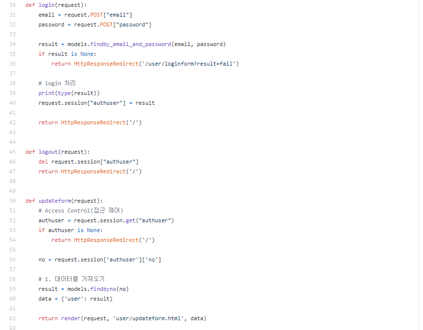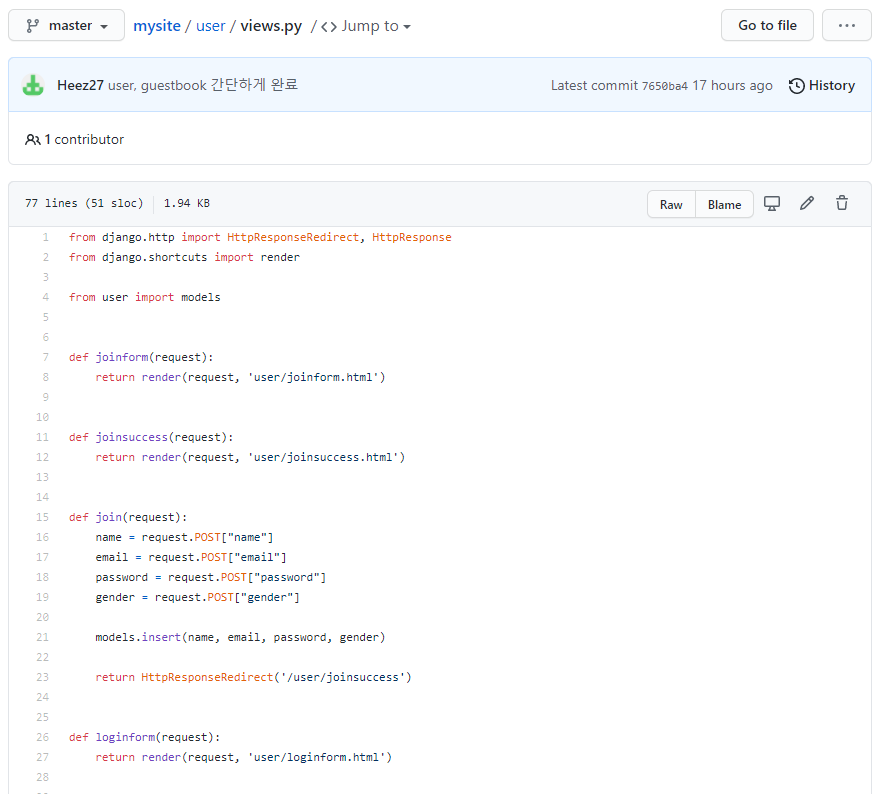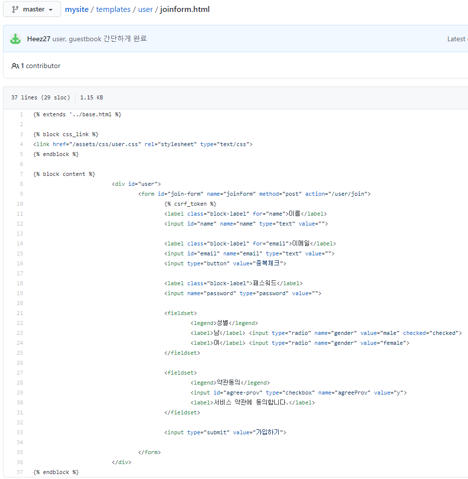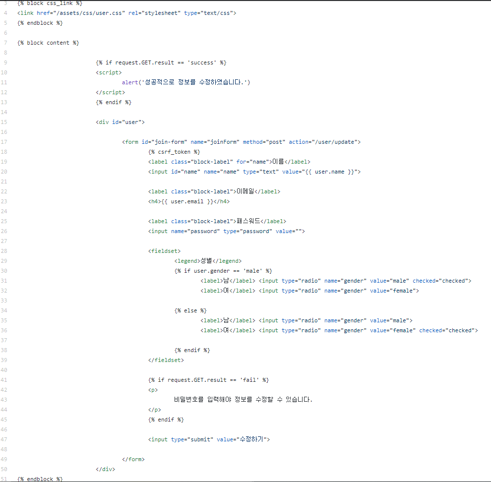 6. 사용자 user 의 모델 (사용자 전체 페이지를 아우름, html 불러옴) user/views.py ↓↓↓↓↓
