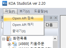 버전처리가 완료되면, 다시 KOA Studio를 실행해, [파일] → [Open API 접속] 메뉴를 선택한 후, 로그인을 한다.