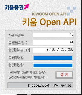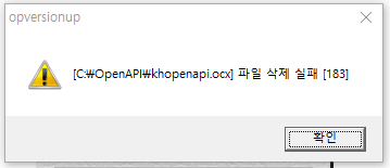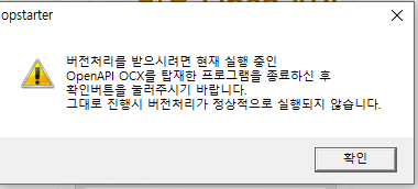 하지만, 나의 경우, '버전처리를 받으시려면 현재 실행 중인 OpenAPI OCX를 탑재한 프로그램을 종료하신 후 확인버튼을 눌러주시기 바랍니다. 그대로 진행시 버전처리가 정상적으로 실행되지 않습니다'라는 창이 떴다..