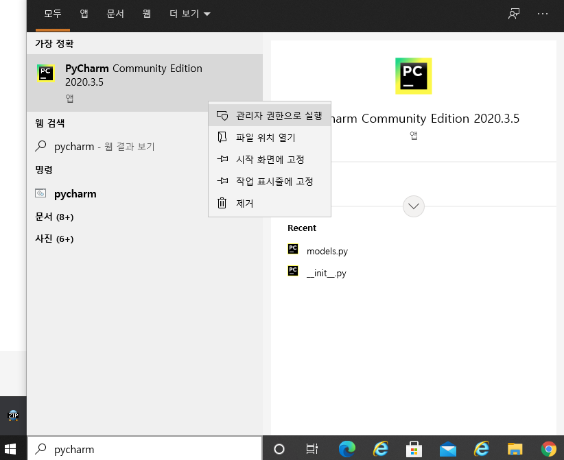 pycharm을 찾은 후, 마우스 오른쪽을 눌러 [관리자 권한으로 실행]을 누른다.