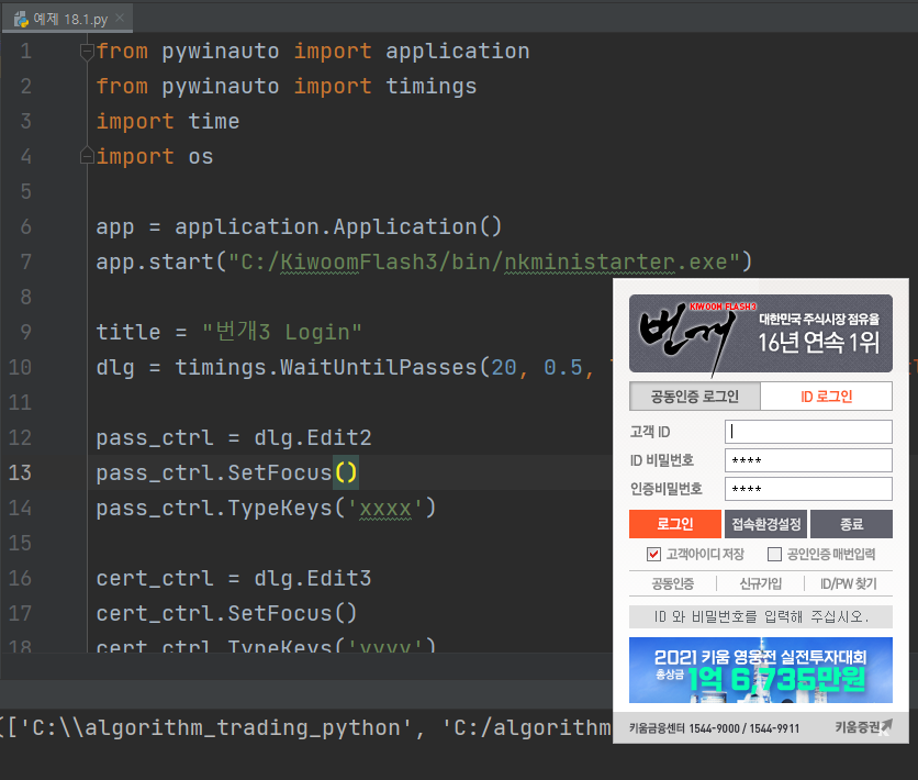3) pywinauto를 이용한 코드 실행 (키움 번개2 자동 로그인 및 종료 스크립트)