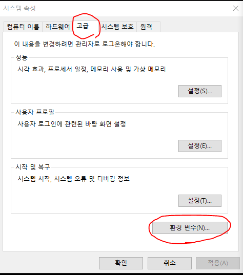 [고급] → [환경변수]를 클릭한다.