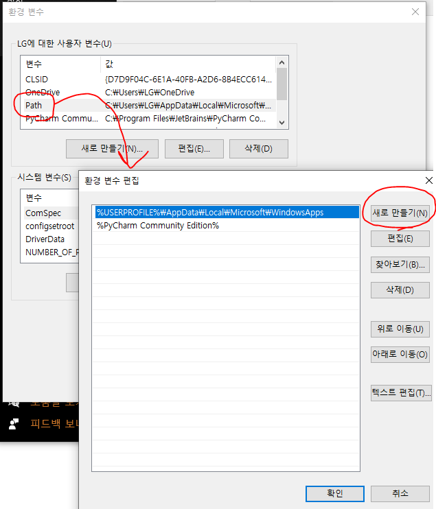 [Path]를 더블클릭 후, [새로 만들기]를 클릭한다.
