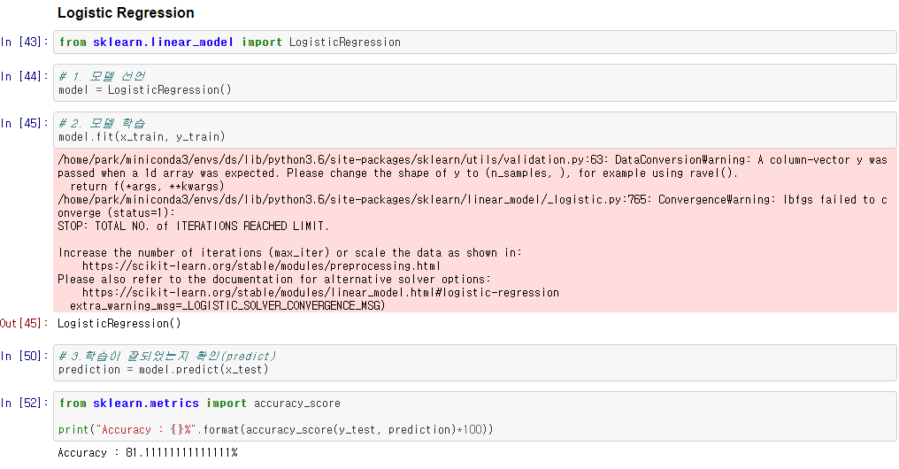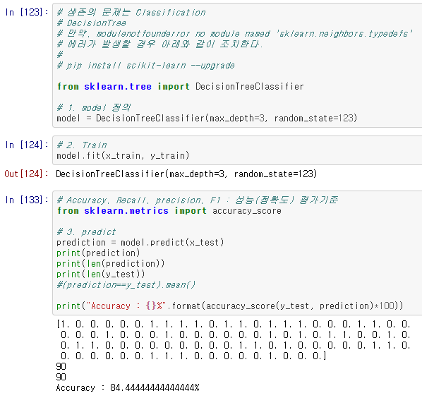파이썬 교육 Day 27 (+ 사이킷런으로 분류하기, Logistic Regression, SGD Classifier, 의사결정 트리 Decision Tree, 불필요한 경고 출력 방지 등)