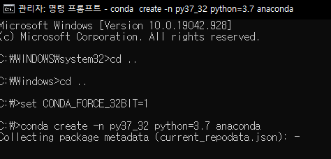 아나콘다 가상환경을 만드는 명령어다. -n은 가상환경의 폴더명을 설정하는 옵션이라 '-n py37_32'는 폴더명이 py37_32인 가상환경이 생성되고, 'python=3.7'은 파이썬 버전을 지정하고 anaconda에 설치한다는 의미이다.