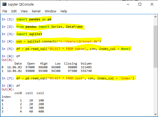 > df = pd.read_sql("SELECT * FROM kakao", con, index_col = None)
